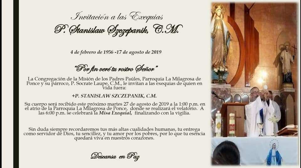 Las exequias del Rev. P. Stanislaw Szczepanik, CM serán el martes, 27 de agosto de 2019 en la Parroquia La Milagrosa de la ciudad de Ponce.