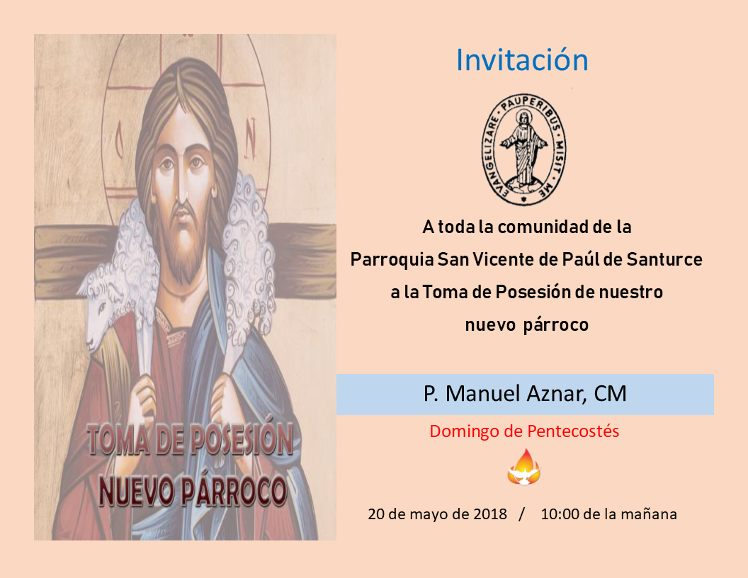Invitamos a toda la Comunidad Parroquial de nuestra Parroquia San Vicente de Paúl de Santurce, a la toma de posesión de nuestro nuevo párroco el Domingo de Pentecostés, 20 de mayo de 2018, a las 10:00 de la mañana.
